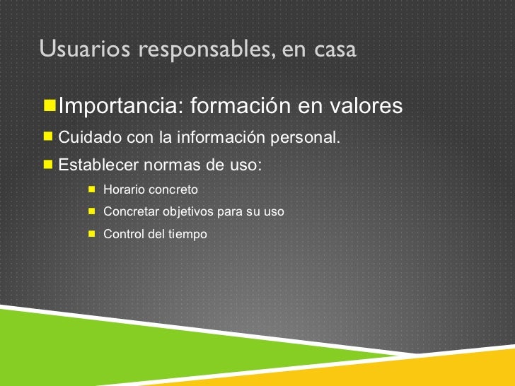 - 10. Usuarios responsables, en casa <ul><li>Importancia: formación en valores </li></ul><ul><li>Cuidado con la información personal. </li></ul><ul><li>Establecer normas de uso: </li></ul><ul><ul><ul><li>Horario concreto </li></ul></ul></ul><ul><ul><ul><li>Concretar objetivos para su uso </li></ul></ul></ul><ul><ul><ul><li>Control del tiempo </li></ul></ul></ul>