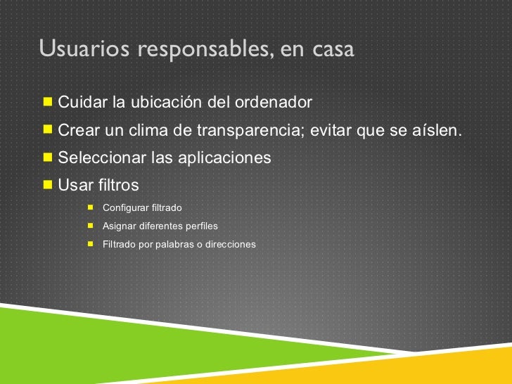 - 11. Usuarios responsables, en casa <ul><li>Cuidar la ubicación del ordenador </li></ul><ul><li>Crear un clima de transparencia; evitar que se aíslen. </li></ul><ul><li>Seleccionar las aplicaciones </li></ul><ul><li>Usar filtros </li></ul><ul><ul><ul><li>Configurar filtrado </li></ul></ul></ul><ul><ul><ul><li>Asignar diferentes perfiles </li></ul></ul></ul><ul><ul><ul><li>Filtrado por palabras o direcciones </li></ul></ul></ul>