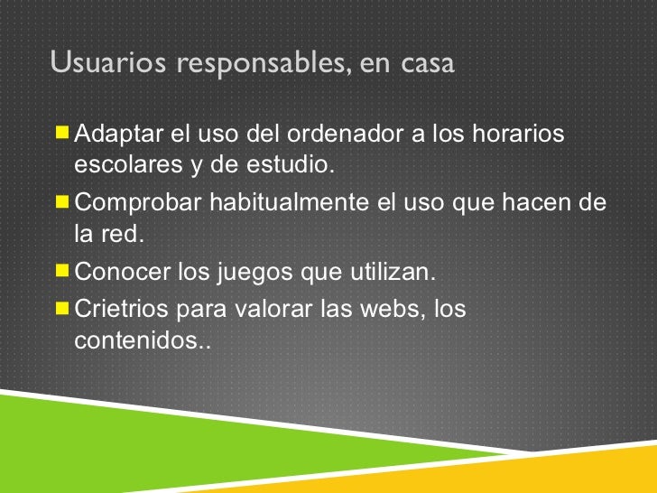 - 12. Usuarios responsables, en casa <ul><li>Adaptar el uso del ordenador a los horarios escolares y de estudio. </li></ul><ul><li>Comprobar habitualmente el uso que hacen de la red. </li></ul><ul><li>Conocer los juegos que utilizan. </li></ul><ul><li>Crietrios para valorar las webs, los contenidos.. </li></ul>