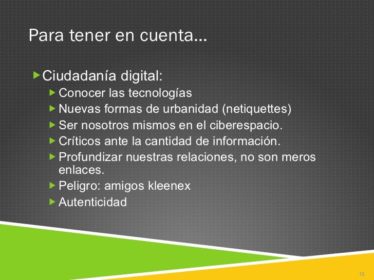 - 13. Para tener en cuenta… <ul><li>Ciudadanía digital: </li></ul><ul><ul><li>Conocer las tecnologías </li></ul></ul><ul><ul><li>Nuevas formas de urbanidad (netiquettes) </li></ul></ul><ul><ul><li>Ser nosotros mismos en el ciberespacio. </li></ul></ul><ul><ul><li>Críticos ante la cantidad de información. </li></ul></ul><ul><ul><li>Profundizar nuestras relaciones, no son meros enlaces. </li></ul></ul><ul><ul><li>Peligro: amigos kleenex </li></ul></ul><ul><ul><li>Autenticidad </li></ul></ul>