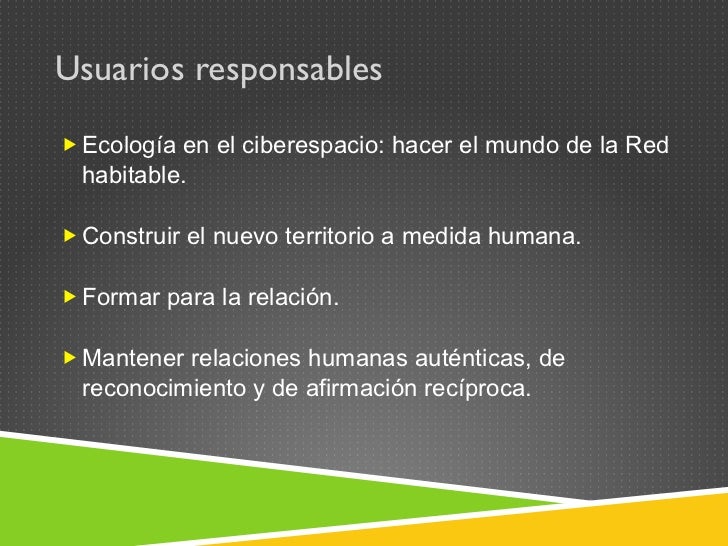 - 14. Usuarios responsables <ul><li>Ecología en el ciberespacio: hacer el mundo de la Red habitable. </li></ul><ul><li>Construir el nuevo territorio a medida humana. </li></ul><ul><li>Formar para la relación. </li></ul><ul><li>Mantener relaciones humanas auténticas, de reconocimiento y de afirmación recíproca. </li></ul>