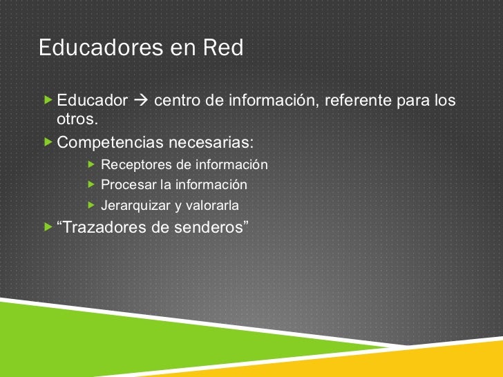 - 15. Educadores en Red <ul><li>Educador centro de información, referente para los otros. </li></ul><ul><li>Competencias necesarias: </li></ul><ul><ul><ul><li>Receptores de información </li></ul></ul></ul><ul><ul><ul><li>Procesar la información </li></ul></ul></ul><ul><ul><ul><li>Jerarquizar y valorarla </li></ul></ul></ul><ul><li>“ Trazadores de senderos” </li></ul>