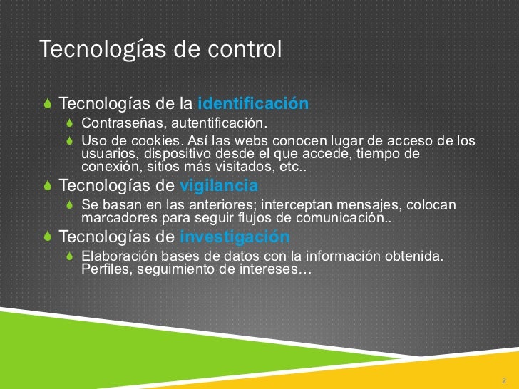 - 2. Tecnologías de control <ul><li>Tecnologías de la identificación </li></ul><ul><ul><li>Contraseñas, autentificación. </li></ul></ul><ul><ul><li>Uso de cookies. Así las webs conocen lugar de acceso de los usuarios, dispositivo desde el que accede, tiempo de conexión, sitios más visitados, etc.. </li></ul></ul><ul><li>Tecnologías de vigilancia </li></ul><ul><ul><li>Se basan en las anteriores; interceptan mensajes, colocan marcadores para seguir flujos de comunicación.. </li></ul></ul><ul><li>Tecnologías de investigación </li></ul><ul><ul><li>Elaboración bases de datos con la información obtenida. Perfiles, seguimiento de intereses… </li></ul></ul>