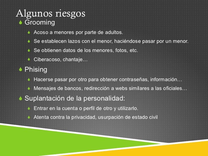 - 3. Algunos riesgos <ul><li>Grooming </li></ul><ul><ul><li>Acoso a menores por parte de adultos. </li></ul></ul><ul><ul><li>Se establecen lazos con el menor, haciéndose pasar por un menor. </li></ul></ul><ul><ul><li>Se obtienen datos de los menores, fotos, etc. </li></ul></ul><ul><ul><li>Ciberacoso, chantaje… </li></ul></ul><ul><li>Phising </li></ul><ul><ul><li>Hacerse pasar por otro para obtener contraseñas, información… </li></ul></ul><ul><ul><li>Mensajes de bancos, redirección a webs similares a las oficiales… </li></ul></ul><ul><li>Suplantación de la personalidad: </li></ul><ul><ul><li>Entrar en la cuenta o perfil de otro y utilizarlo. </li></ul></ul><ul><ul><li>Atenta contra la privacidad, usurpación de estado civil </li></ul></ul>