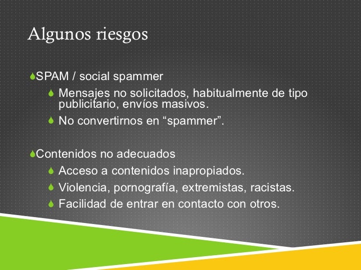 - 5. Algunos riesgos <ul><li>SPAM / social spammer </li></ul><ul><ul><li>Mensajes no solicitados, habitualmente de tipo publicitario, envíos masivos. </li></ul></ul><ul><ul><li>No convertirnos en “ spammer ” . </li></ul></ul><ul><li>Contenidos no adecuados </li></ul><ul><ul><li>Acceso a contenidos inapropiados. </li></ul></ul><ul><ul><li>Violencia, pornografía, extremistas, racistas. </li></ul></ul><ul><ul><li>Facilidad de entrar en contacto con otros. </li></ul></ul>