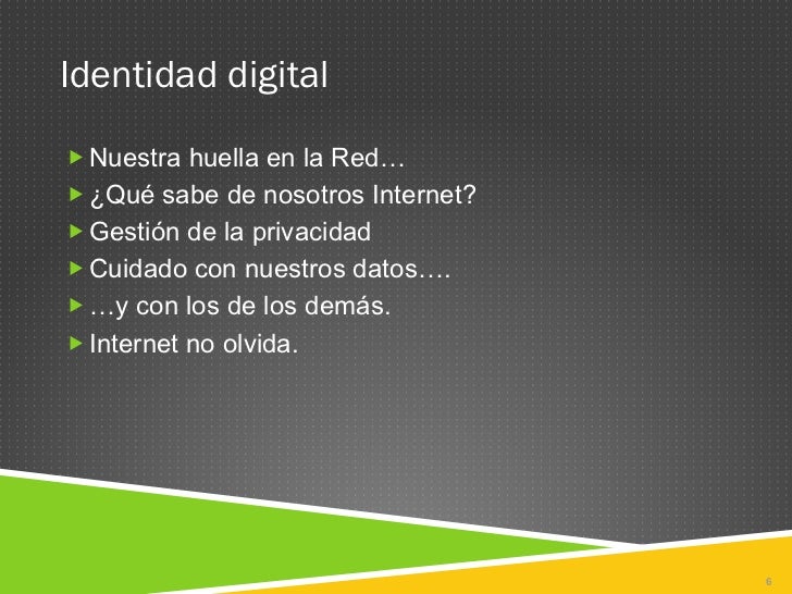 - 6. Identidad digital <ul><li>Nuestra huella en la Red… </li></ul><ul><li>¿Qué sabe de nosotros Internet? </li></ul><ul><li>Gestión de la privacidad </li></ul><ul><li>Cuidado con nuestros datos…. </li></ul><ul><li>… y con los de los demás. </li></ul><ul><li>Internet no olvida. </li></ul>