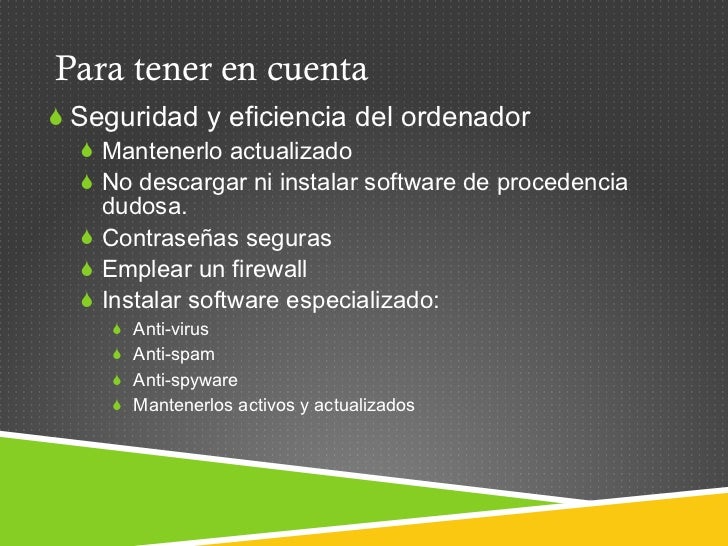 - 7. Para tener en cuenta <ul><li>Seguridad y eficiencia del ordenador </li></ul><ul><ul><li>Mantenerlo actualizado </li></ul></ul><ul><ul><li>No descargar ni instalar software de procedencia dudosa. </li></ul></ul><ul><ul><li>Contraseñas seguras </li></ul></ul><ul><ul><li>Emplear un firewall </li></ul></ul><ul><ul><li>Instalar software especializado: </li></ul></ul><ul><ul><ul><li>Anti-virus </li></ul></ul></ul><ul><ul><ul><li>Anti-spam </li></ul></ul></ul><ul><ul><ul><li>Anti-spyware </li></ul></ul></ul><ul><ul><ul><li>Mantenerlos activos y actualizados </li></ul></ul></ul>