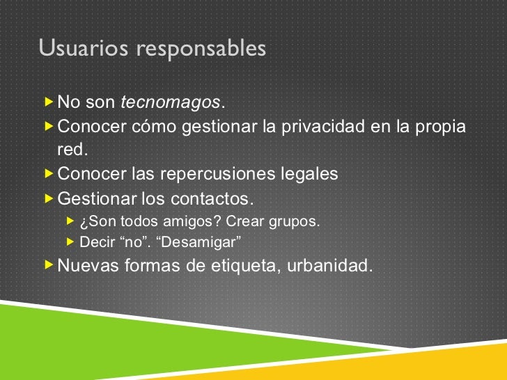 - 9. Usuarios responsables <ul><li>No son tecnomagos . </li></ul><ul><li>Conocer cómo gestionar la privacidad en la propia red. </li></ul><ul><li>Conocer las repercusiones legales </li></ul><ul><li>Gestionar los contactos. </li></ul><ul><ul><li>¿Son todos amigos? Crear grupos. </li></ul></ul><ul><ul><li>Decir “no”. “Desamigar” </li></ul></ul><ul><li>Nuevas formas de etiqueta, urbanidad. </li></ul>